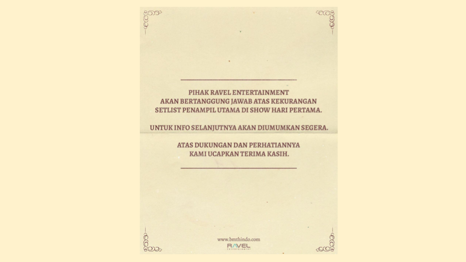 Ravel Entertainment Mengumumkan Konser BMTH Jakarta Hari Kedua Dibatalkan