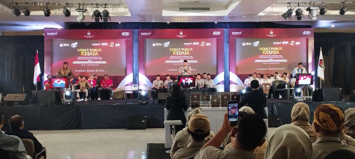 KOMISI Pemilihan Biasa (KPU) Kota Tegal, Jawa Tengah, kembali menggelar debat kedua atau terakhir Kekasih Calon (Paslon) Wali Kota dan Wakil Wali Kota Tegal. Debat publik tersebut digelar di Sebayu Convention Hall Bahari Inn, Tegal, Rabu (13/11/2024) malam.