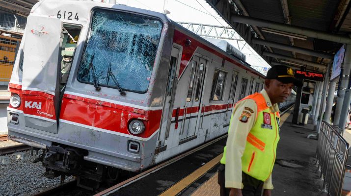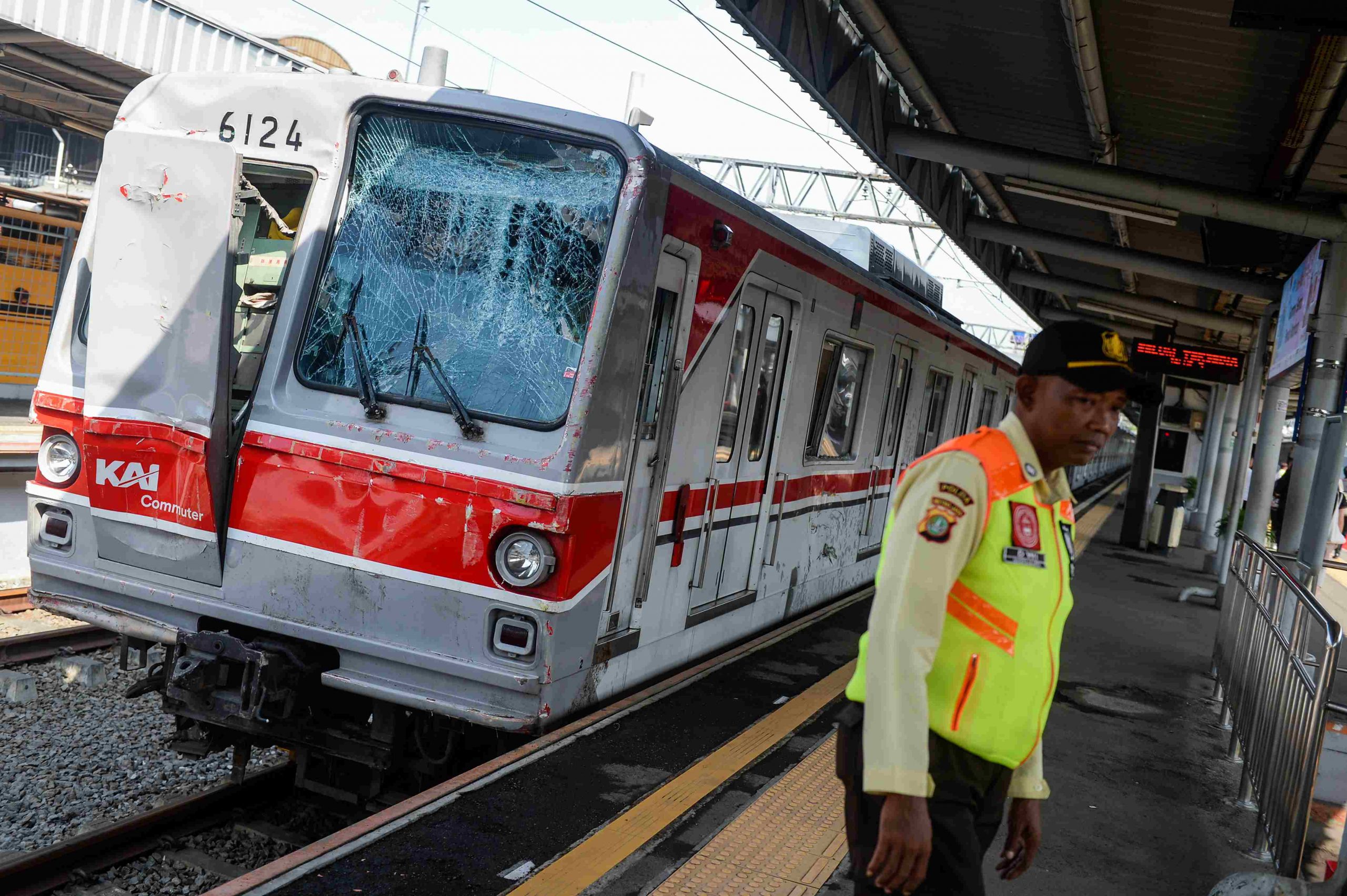Petugas Menonton kondisi kereta rel listrik (KRL) Commuter Line yang rusak akibat menabrak truk di Stasiun Tangerang, Kota Tangerang, Banten, Jumat (20/6/2025). KRL Commuter Line Rekanan Duri-Tangerang mengalami kerusakan berat pada bagian kabin masinis akibat menabrak truk boks di perlintasan sebidang kereta antara Stasiun Tangerang-Batu Ceper yang mengakibatkan jadwal perjalanan sempat terganggu dan Enggak Eksis korban jiwa dalam persitiwa tersebut. ANTARA FOTO/Putra M. Akbar/Ppj