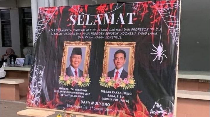 Karangan Merekah itu betuliskan “Selamat atas dilantiknya Jenderal bengis pelanggar HAM dan Profesor IPK 2,3, sebagai Presiden dan Wakil Presiden Republik Indonesia yang lahir dari rahim haram konstitusi, Jenderal TNI Prabowo Subianto Djojohadikusumo (Ketua Tim Mawar) – Gibran Rakabuming Raka (Admin Fufufafa”.