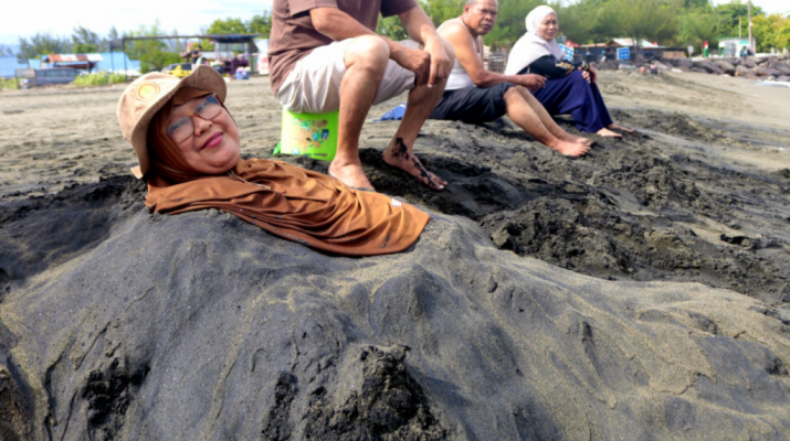 Anggota Kota Banda Aceh, Nelita Mutia, 53, mengubur sebagian tubuhnya dalam pasir hitam di bibir pantai Syiah Kuala, Banda Aceh, Aceh. Foto: Liputanindo.id/Fajri Fatmawati