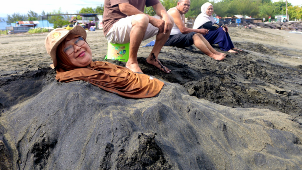 Anggota Kota Banda Aceh, Nelita Mutia, 53, mengubur sebagian tubuhnya dalam pasir hitam di bibir pantai Syiah Kuala, Banda Aceh, Aceh. Foto: Liputanindo.id/Fajri Fatmawati
