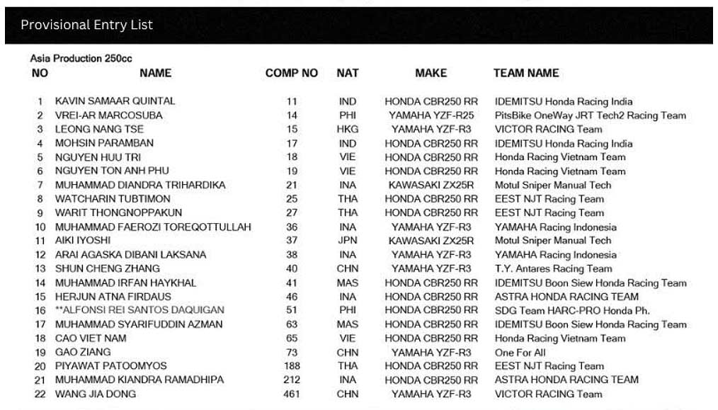 Tetapi begitu Tiba menjelang FP1 seri pembuka Jumat ini di siruit Chang – Buriram, entry list hadir 22 pembalap dimana jenis motornya hanya terdiri dari 4 jenis, yakni Yamaha R3 (6 entry), Yamaha R25 (1 entry), Honda CBR250RR (13 entry), dan Kawasaki Ninja ZX25R (2 entry).