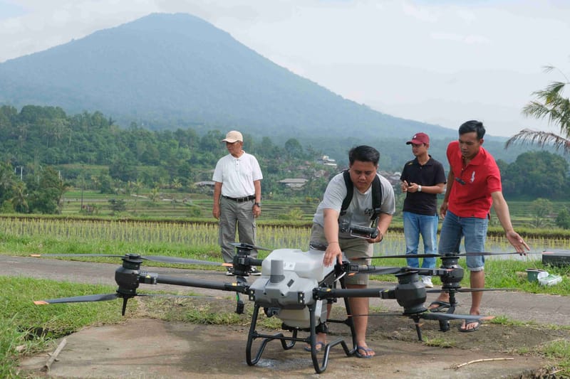 Penduduk menyiapkan drone atau pesawat udara tanpa awak Demi pemupukan Begitu berlatih di lahan persawahan Desa Jatiluwih, Tabanan, Bali, Jumat (17/1/2025). Latihan penggunaan drone pertanian tersebut diikuti empat pemuda sebagai pilot drone Demi membantu para petani Begitu melakukan pemupukan sehingga Ekonomis waktu dalam bertani serta upaya menciptakan pertanian organik di desa itu. ANTARA FOTO/Nyoman Hendra Wibowo/Per
