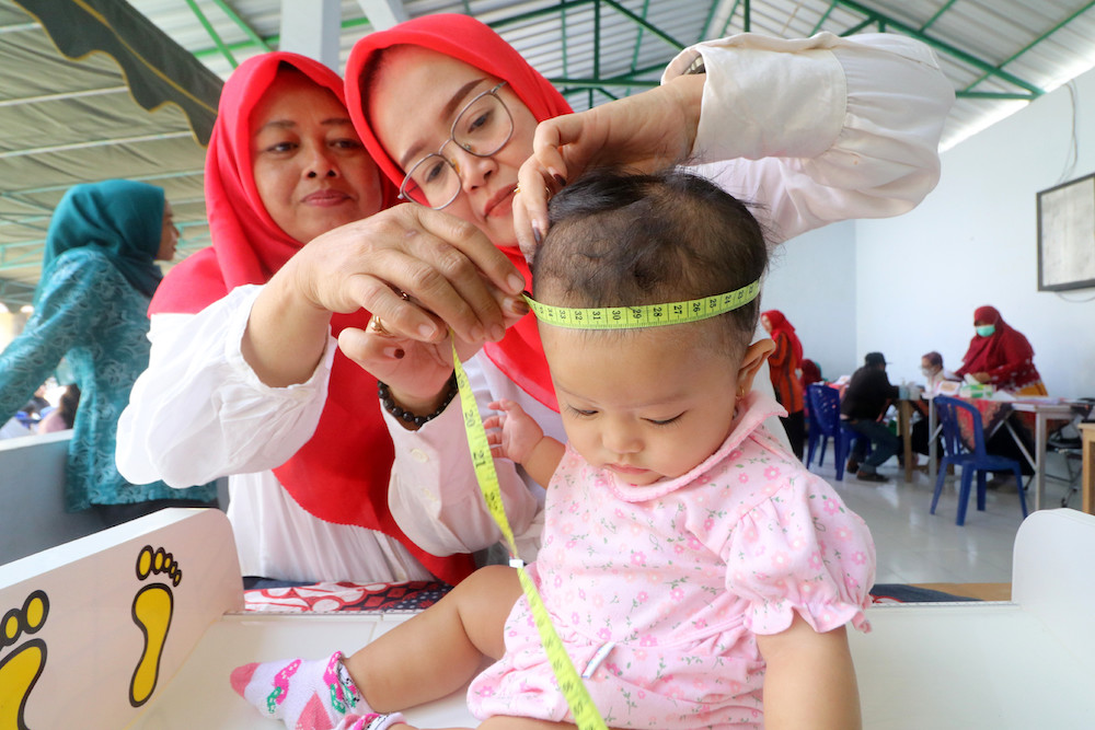Petugas mengukur lingkar kepala bayi Ketika layanan posyandu di Kelurahan Sudut, Kota Kediri, Jawa Timur, Kamis (21/8/2025). Pemerintah Maju berupaya menurunkan Bilangan Mortalitas bayi (AKB) usia 0–1 tahun dengan Sasaran 12 per 1.000 Natalis hidup pada tahun 2030. Perkembangan ini mulai terlihat melalui data Badan Pusat Statistik (BPS) yang mencatat penurunan AKB dalam beberapa tahun terakhir, yakni 16,9 per 1.000 Natalis pada 2020, 16,2 pada 2021, 15,2 pada 2022, 14,8 pada 2023, dan 14,1 per 1.000 Natalis pada 2024. ANTARA FOTO/Prasetia Fauzani/sas
