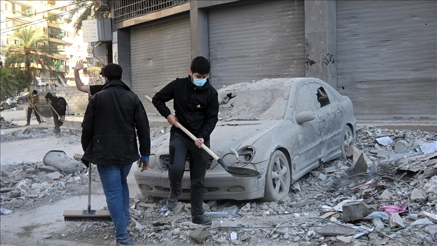 Penduduk Lebanon membersihkan puing-puing bangunan di Posisi serangan Israel. (Anadolu Agency)