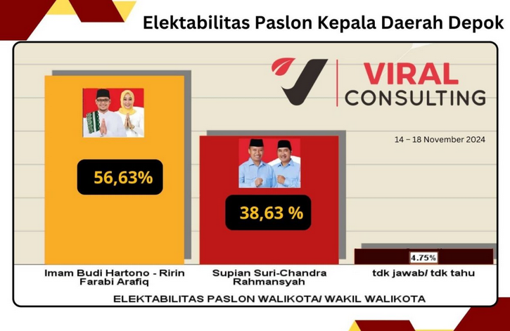 Hal itu terungkap dalam hasil survei teranyar Pilkada Depok 2024 yang dirilis Lembaga Survei Viral Consulting, Sabtu (23/11/2024). Peneliti Viral Consulting, Yusuf Donner menyebut Kekasih Imam-Ririn kokoh dan tak terkejar elektabilitasnya menjelang pencoblosan 27 November nanti.