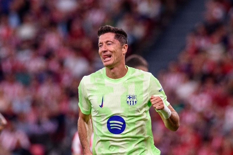 Penyerang Barcelona Robert Lewandowski merayakan golnya ke gawang Athletic Bilbao dalam laga pekan pemungkas Aliansi Spanyol 2024/25 di Stadion San Mames, Bilbao, Spanyol, Minggu (25/5/2025) waktu setempat. ANTARA/X/@LaLiga (X@Laliga)