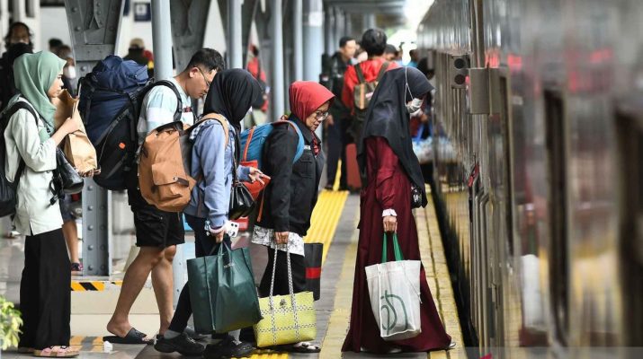 Sejumlah calon penumpang antre menaiki kereta api jarak jauh di Stasiun Pasar Senen, Jakarta Pusat, Sabtu (25/1/2025). PT KAI Daop 1 Jakarta mencatat penumpang kereta api yang berangkat dari Pasar Senen pada Sabtu pagi (25/1) sebanyak 21.496 orang berkenaan dengan masa libur Isra Miraj dan Tahun Baru Imlek 2025. ANTARA FOTO/Fakhri Hermansyah/nym.