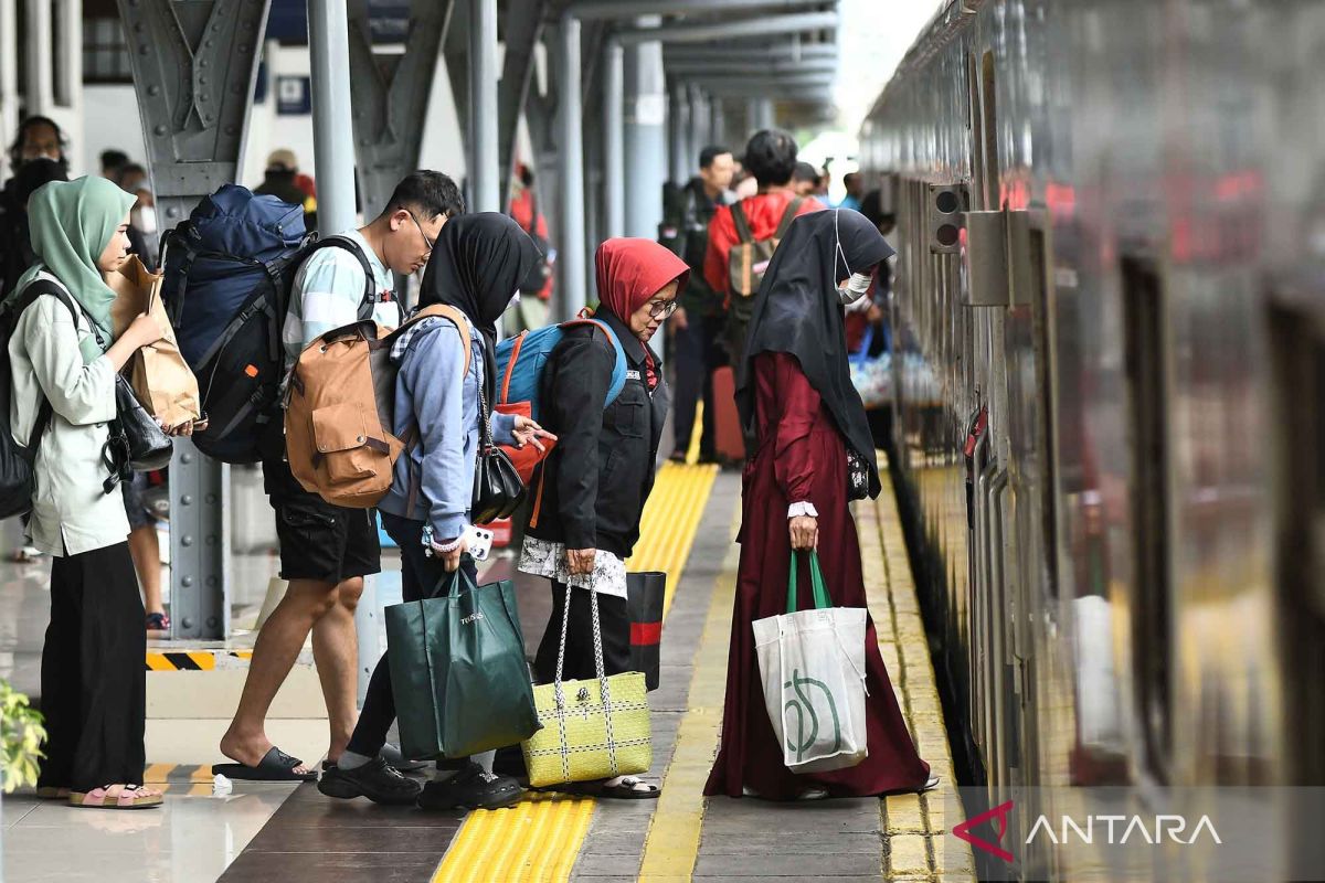 Sejumlah calon penumpang antre menaiki kereta api jarak jauh di Stasiun Pasar Senen, Jakarta Pusat, Sabtu (25/1/2025). PT KAI Daop 1 Jakarta mencatat penumpang kereta api yang berangkat dari Pasar Senen pada Sabtu pagi (25/1) sebanyak 21.496 orang berkenaan dengan masa libur Isra Miraj dan Tahun Baru Imlek 2025. ANTARA FOTO/Fakhri Hermansyah/nym.