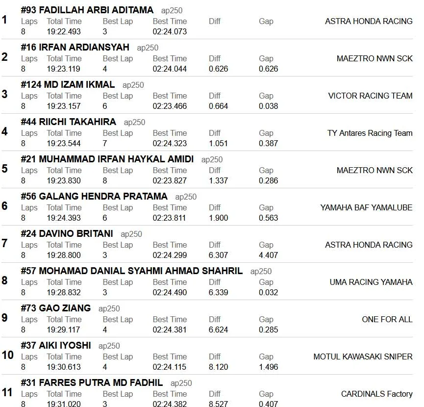Tetapi hasil race Berbicara lain, pembalap Astra Honda Racing Team team ini berhasil membawa CBR250RR memenangkan Race 1 dan mengoleksi 25 poin full Buat ditambahkan ke klasemen sementara AP250 tahun ini.