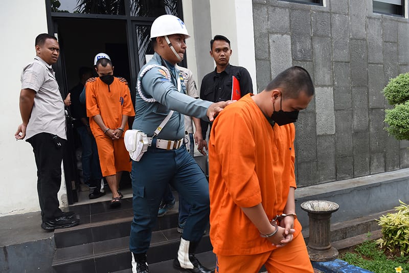 Tersangka dibawa petugas menuju mobil tahanan usai dihadirkan dalam konferensi pers pelimpahan berkas perkara dan penyerahan tersangka pelaku penembakan pemilik rental mobil dari Puspomal kepada Oditur Militer II-07 Jakarta di Markas Puspomal, Jakarta, Rabu (15/1/2025). Pusat Polisi Militer TNI Angkatan Laut (Puspomal) melimpahkan berkas perkara penembakan yang menyebabkan Mortalitas pemilik rental mobil di Rest Area Km 45 Tol Tangerang-Merak kepada Oditur Militer II-07 Jakarta Demi segera disidangkan, dengan ketiga tersangka yang merupakan Personil TNI AL yakni Sertu AA, Sertu RH, dan Kelasi Kepala (KLK) BA. ANTARA/Indrianto Eko Suwarso/gus
