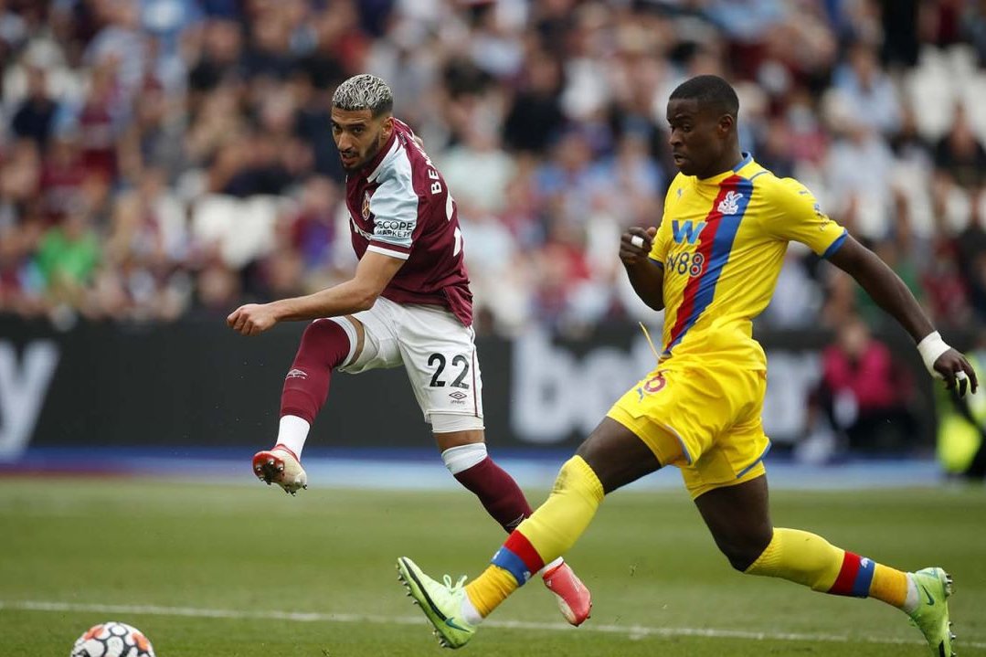 Arsip – Pemain West Ham United Said Benrahma menendang bola dengan dikawal pemain Crystal Palace Marc Guehi pada laga Aliansi Inggris di London Stadium, Inggris (28/8/2021). ANTARA FOTO/Action Images via Reuters/Matthew Childs/aww.Arsip – Pemain West Ham United Said Benrahma menendang bola dengan dikawal pemain Crystal Palace Marc Guehi pada laga Aliansi Inggris di London Stadium, Inggris (28/8/2021). ANTARA FOTO/Action Images via Reuters/Matthew Childs/aww.