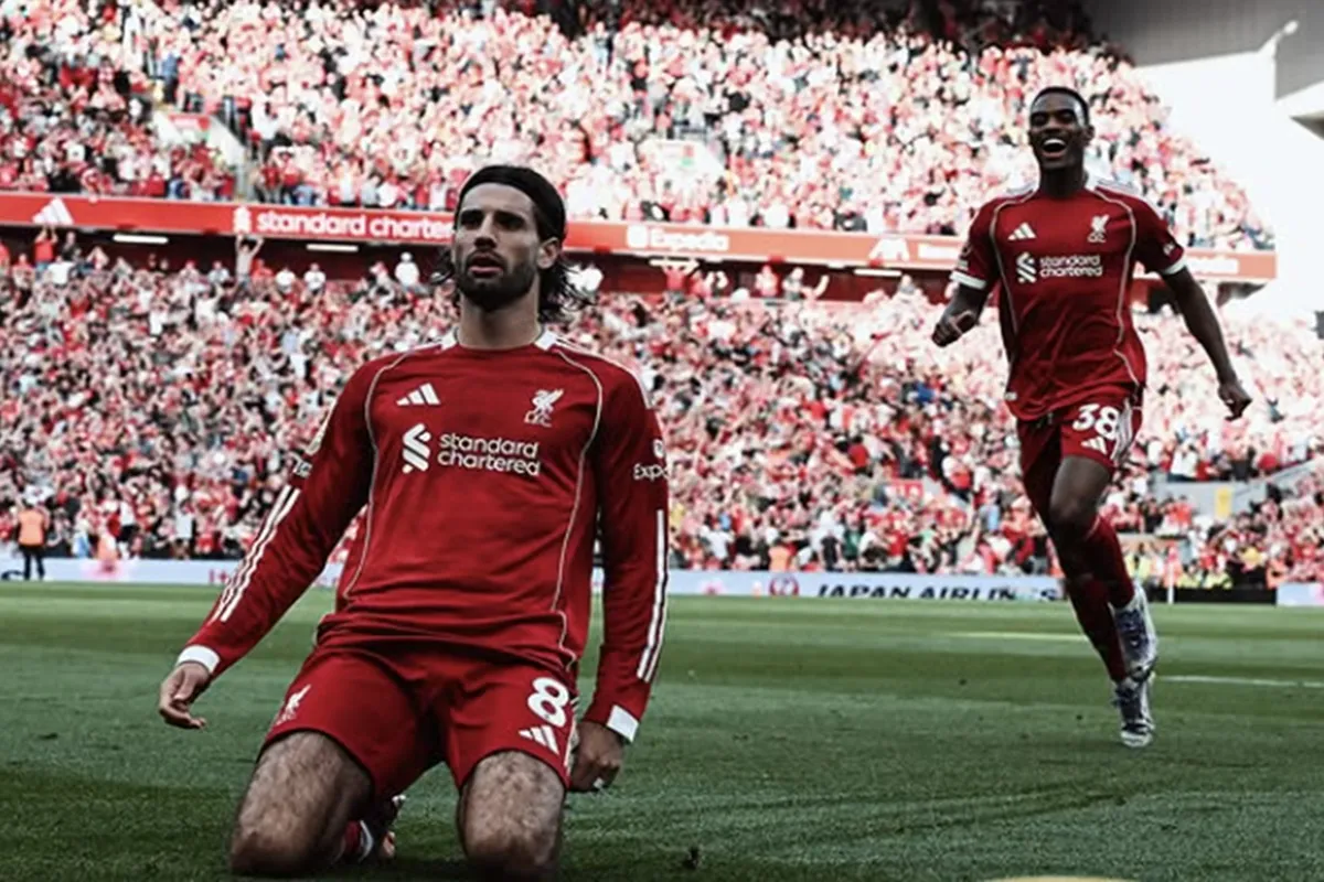Liputanindo.id – Pemain Liverpool, Dominik Szoboszlai (kiri), melakukan selebrasi seusai menjebol gawang Arsenal melalui free kick sensasional dalam laga Aliansi Premier Inggris di Stadion Anfield, Minggu (31/8/2025) malam. Liverpool menang dengan skor 1-0. (Instagram/liverpoolfc)