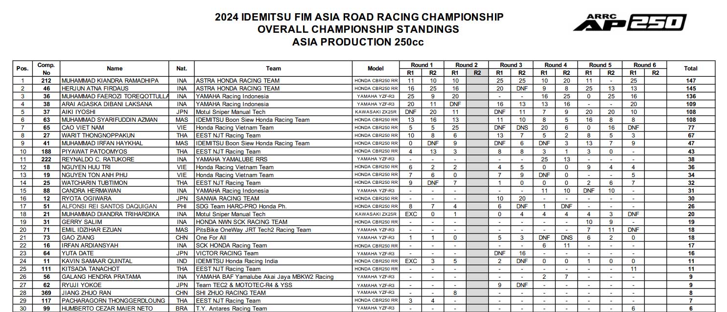 liputanindo.com – Setelah Pimpinan Klasemen AP250 sebelumnya – Herjun Atna Firdaus dari AHRT Finish di Posisi 4 sementara Bagus Ramadhipa, Arai Agaska dan Faerozzi finish Top-3 Membikin Persaingan Penentuan Gelar Pemenang ASIA AP250 2024 makin Pans Jelang Race 2 Hari ini