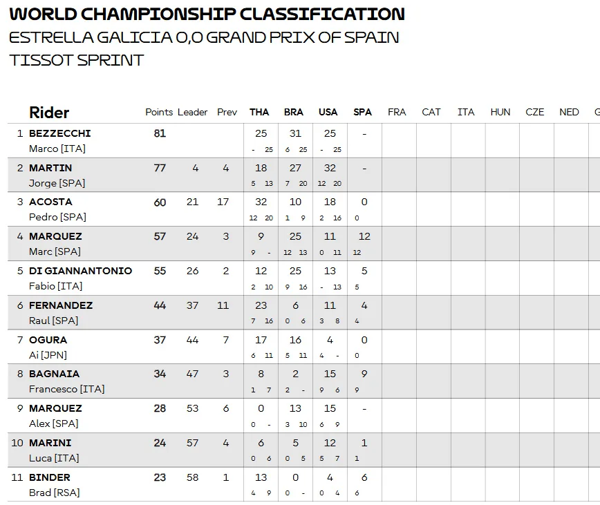 Berikut adalah Klasmeen pasca Sprint Jerez :