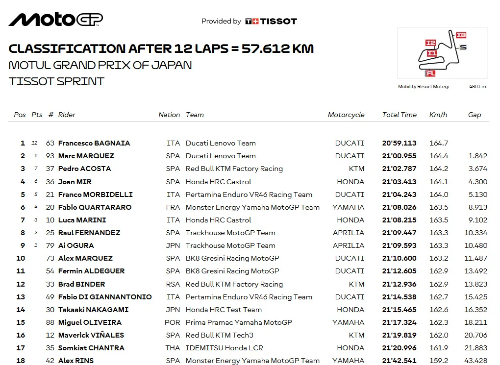 2.184 hari, menjalani banyak operasi, tiga tim, dua pabrikan, lebih banyak rekor, dan gelar Pemenang MotoGP ketujuh, ia berdiri di puncak dunia – setelah melakukan comeback terhebat dalam sejarah olahraga Pas ketika ia finish kedua di Balapan Seri ke 17 Motegi 2025 yang berlangung sebagai berikut.: