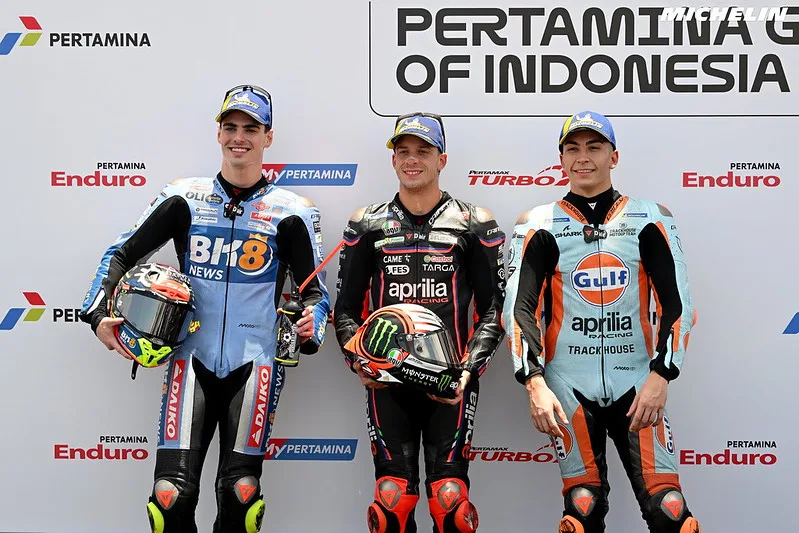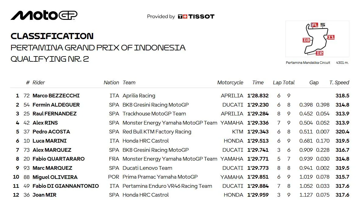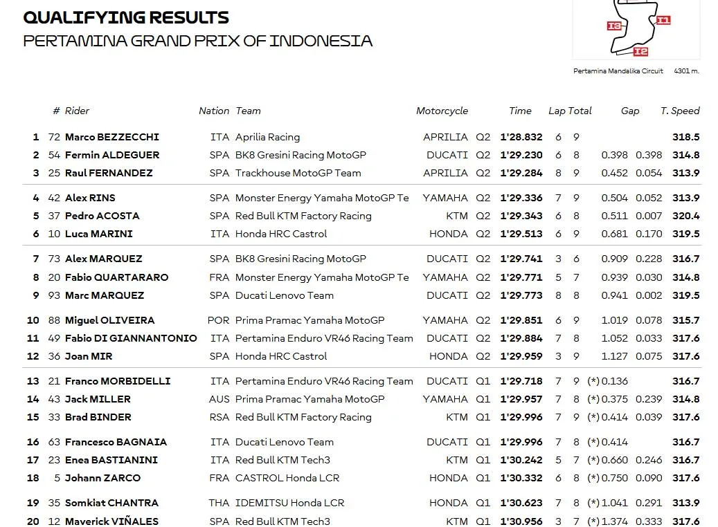 Dan akhirnnya setelah 15 menit , dengan Laptime rekor Baru, Marco Bezzecchi Raih Pole Position MotoGP Mandalika – Indonesia 2025 dan berhak start dari posisi terdepan pada sprint beberapa jam Kembali dan Balapan Esensial esok Ahad. Aldeguer P2 Raul Fernandez P3. Marc Marquez P9