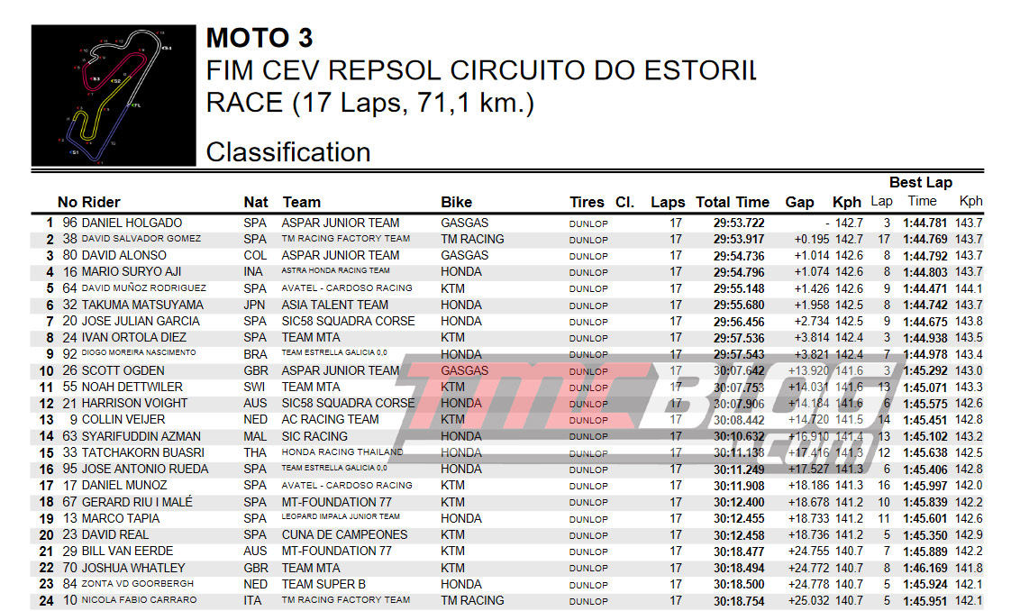 liputanindo.com – Moto3 Junior World Championship melakukan Balapan perdananya hari ahad ini di Sirkuit Estoril dimana Ivan Ortola Start dari Posisi terdepan sementara pembalap Indonesia Mario Suryo Aji start dari posisi Grid Ke 8. Setelah start dilakuan Daniel holgado memimpin sementara Mario Aji berada di Posisi 8 pada akhir Lap pertama dengan jarak Sekeliling 1,4 detik