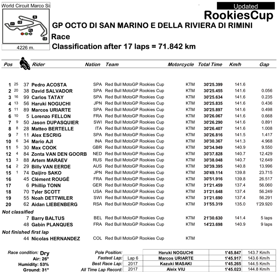 Ketika balapan berjalan Sekeliling 12 Lap Barulah Mario terpisah jarak waktu Sekeliling satu Tiba dua detik. Grup terdepan tetap bergantian dipimpin oleh pembalap yang berbeda Tiba akhirnnya Pedro Acosta Memenangkan race di depan David Salvador dan Carlos Tatay. Sementara Mario Aji berhasil mengamankan Point atau posisi finish 10.