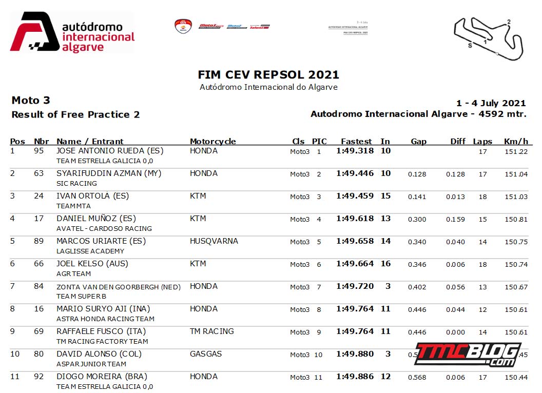 liputanindo.com – Dalam Jadwal Formal CEV, Pada dasarnya Kamis dan Jumat 1/2 Juli 2021 ini Kagak menjadi paket race weekend CEV Bagus Moto2 European Championship dan Moto3 JWCh Algarve. Statusnya adalah ‘ test ‘ Algarve . . Dua sesi Latihan bebas  pada kedua hari ini dinamakan FP1 dan FP2. Tetapi Tak mengapalah Kita bahasa dua sesi di hari Jumat ini. Pada FP1 Pembalap Indonesia Mario Aji berhasil menempatkan diri di P7 dengan laptime terpaut 0,559 detik dari pebalap tercepat Joel Kelso( 1:48,288) . Nah pada sesi FP2 Tamat 15 menit terakhir laptime tercepat Tetap di kisaran 1:51-an . .