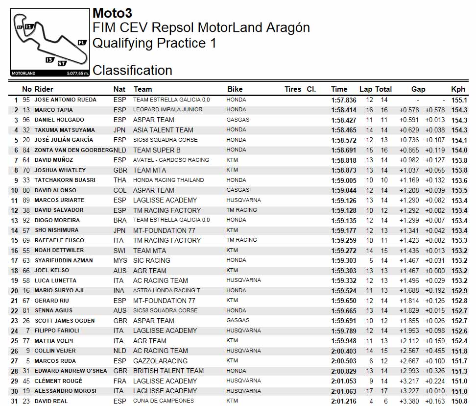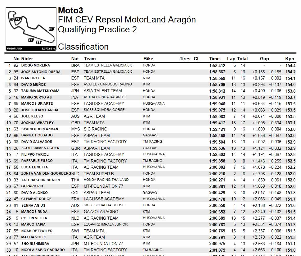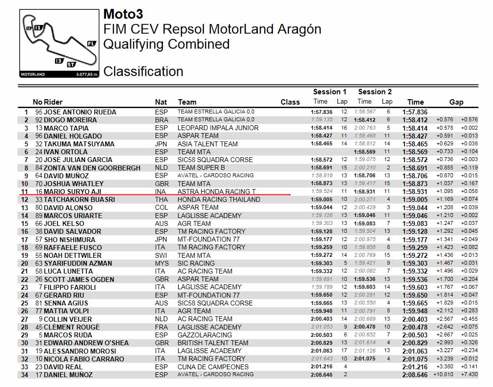 Sementara Mario Aji berada di posisi 20 dengan Laptime tercepat di Bilangan 1:59,524 atau 1,688 detik lebih Lamban dari Laptime yang ditorehkan Rueda. Sementara takuma Matsuyama menjadi Pembalap Junior talent team terdepan di Sesi Q1 ini dengan Berada di posisi empat.