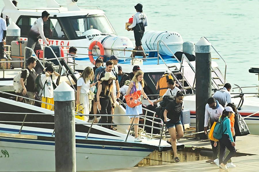 Wisatawan mancanegara menuruni kapal Segera setibanya di Pelabuhan Sanur, Denpasar, Bali, Selasa (3/6/2025). Badan Pusat Statistik Bali mencatat kunjungan wisatawan mancanegara (wisman) ke Pulau Bali pada bulan April 2025 mencapai 591.221 orang atau meningkat 25,56 persen Apabila dibandingkan jumlah kunjungan wisman bulan sebelumnya dengan mayoritas wisman berasal dari Australia. ANTARA/Fikri Yusuf/gus
