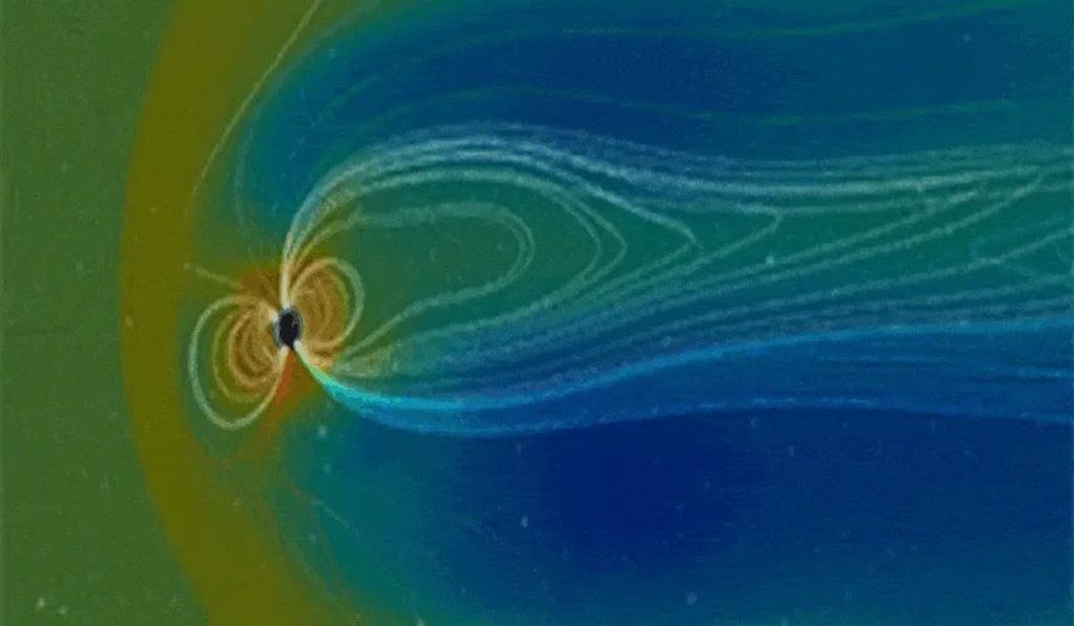Medan magnet Bumi, yang dihasilkan dari logam Likuid dalam inti planet, membentang hingga ratusan ribu kilometer ke angkasa. Fungsinya vital: membelokkan partikel berbahaya dari Mentari yang dapat melucuti atmosfer.