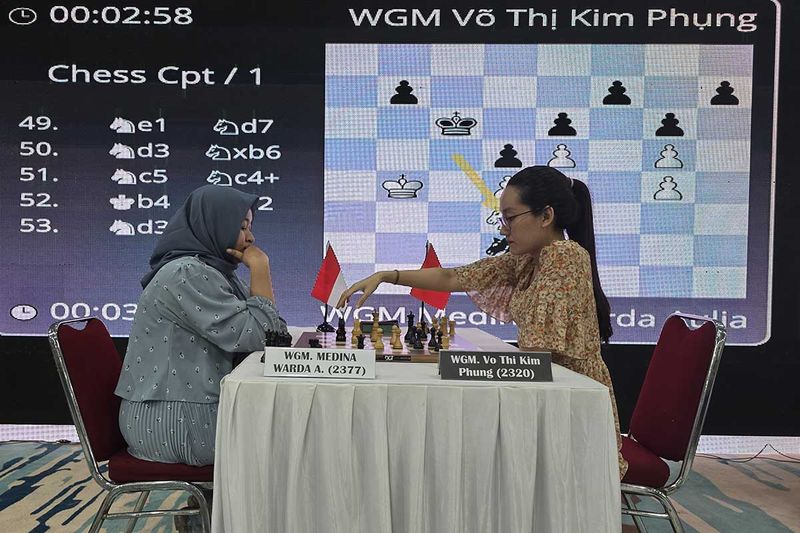 PECATUR putri papan atas Indonesia WGM Medina Warda Aulia harus mengakui keunggulan pecatur Vietnam WGM Vo Thi Kim Phung setelah kalah 3-7 dalam Meet International Japfa Chess Festival 2024 di Gedung Wisma Serba Guna Gelora Bung Karno (GBK), Senayan, Jakarta, Selasa (20/8).