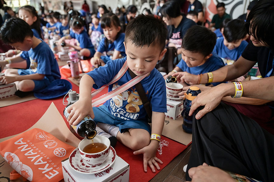 Seorang anak menuangkan teh ke dalam gelas Demi mengikuti praktik minum teh berkesadaran penuh atau tea meditation dalam rangkaian Gemilang Waisak 2025 di Jakarta, Senin (12/5/2025). Wihara Ekayana Arama menggelar Gemilang Waisak 2025 dengan kegiatan mindful walk, mindful sharing dan tea meditation yang menjadi ruang Cerminan dan selebrasi nilai-nilai spritual Buddha dengan mengangkat praktik hidup sadar-penuh dalam keseharian. ANTARA FOTO/Fauzan/bar