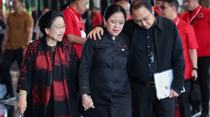 Ketua Lazim DPP PDI Perjuangan (PDIP), Megawati Soekarnoputri (kiri), Serempak Ketua DPP PDIP, Puan Maharani (tengah), dan Ketua DPP PDIP Bidang Ekonomi Kreatif, M. Prananda Prabowo (kanan), berjalan memasuki Posisi acara Bimbingan Teknis (Bimtek) bagi Personil DPR, DPRD provinsi, dan kabupaten/kota Fraksi PDI Perjuangan periode 2024–2029 di The Meru, Bali Beach Convention Center, Denpasar, Bali, Rabu (30/7/2025). Bimtek yang diikuti Sekeliling 3.200 peserta ini menjadi ajang pembekalan sekaligus konsolidasi internal terbesar PDIP Kepada memperkuat soliditas partai.ANTARA FOTO/Monang Sinaga/sas