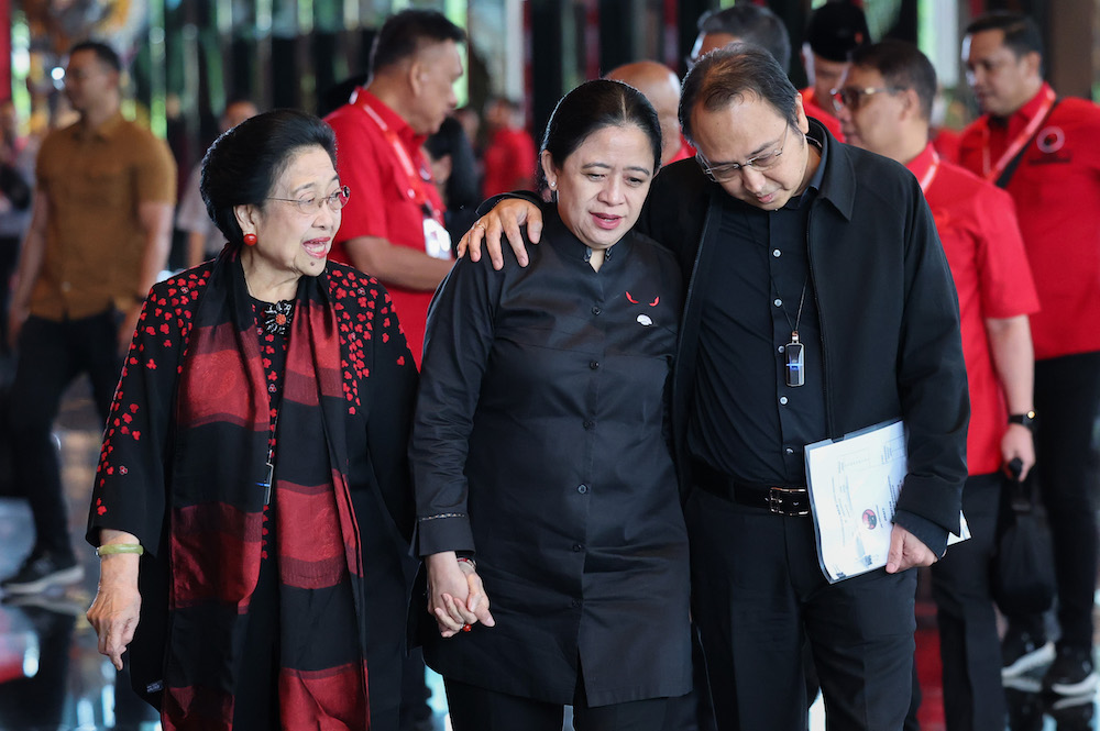 Ketua Lazim DPP PDI Perjuangan (PDIP), Megawati Soekarnoputri (kiri), Serempak Ketua DPP PDIP, Puan Maharani (tengah), dan Ketua DPP PDIP Bidang Ekonomi Kreatif, M. Prananda Prabowo (kanan), berjalan memasuki Posisi acara Bimbingan Teknis (Bimtek) bagi Personil DPR, DPRD provinsi, dan kabupaten/kota Fraksi PDI Perjuangan periode 2024–2029 di The Meru, Bali Beach Convention Center, Denpasar, Bali, Rabu (30/7/2025). Bimtek yang diikuti Sekeliling 3.200 peserta ini menjadi ajang pembekalan sekaligus konsolidasi internal terbesar PDIP Kepada memperkuat soliditas partai.ANTARA FOTO/Monang Sinaga/sas