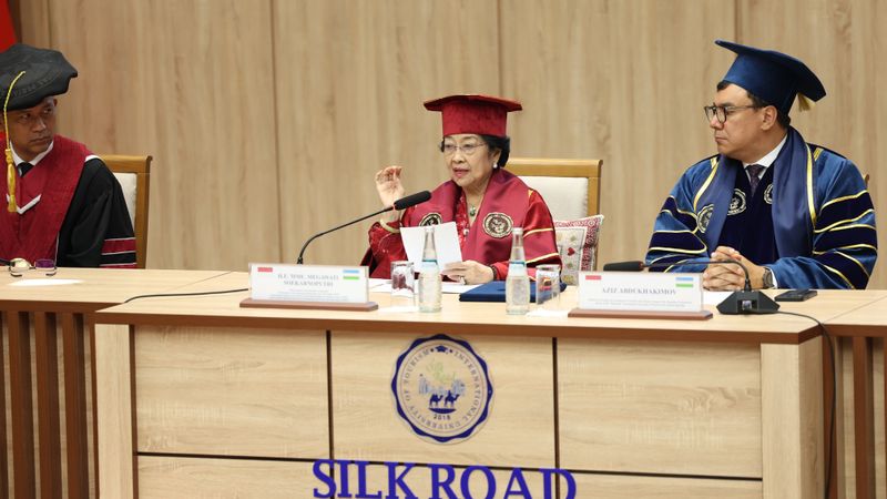 Liputanindo.id – Presiden Kelima RI Megawati Soekarnoputri memberikan orasi ilmiah untuk penganugerahan gelar profesor kehormatan bidang pariwisata dan warisan budaya dari Siilk Road International University of Tourism and Cultural Heritage (IUTCH), Uzbekistan, pada Sabtu (21/9/2024).
