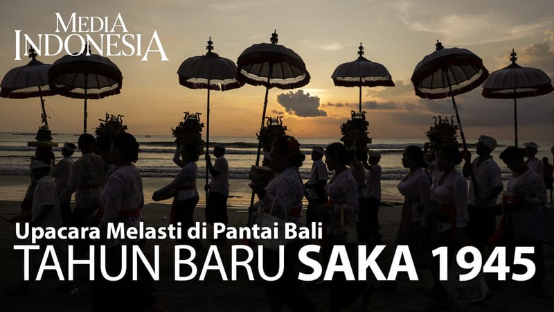 Ribuan umat Hindu Bali mengikuti upacara Melasti jelang hari Kudus Nyepi tahun Saka 1945 di Pantai Kuta dan Pantai Petitenget, Bali, Minggu (19/3/2023). Upacara Melasti kembali diikuti seluruh Penduduk karena dua tahun sebelumnya Demi covid-19 hanya diikuti perwakilan saja.