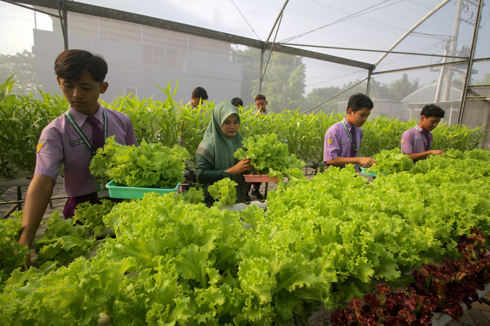 Santri memanen sayuran hasil budi daya Sendiri dengan menggunakan metode hidroponik di Green House Pondok Pesantren Progresif Bumi Shalawat Sidoarjo, Jawa Timur, Rabu (18/6/2025).Kegiatan tersebut selain Kepada memenuhi kebutuhan pangan internal pesantren juga Kepada melatih santri dalam bidang agrikultur modern yang berorientasi bisnis. ANTARA FOTO/Umarul Faruq/sas