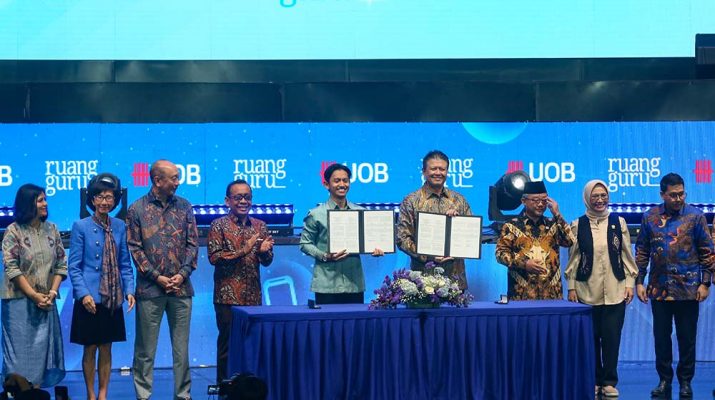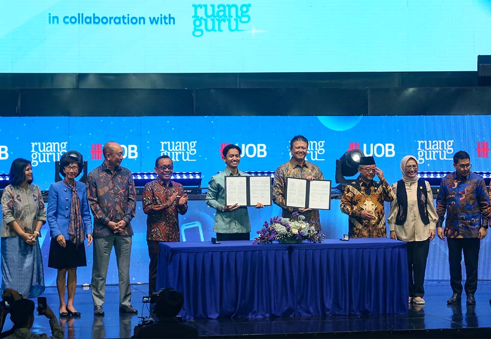 Menko Bidang Pembangunan Insan dan Kebudayaan, Pratikno (keempat kiri), Menteri Pendidikan Dasar dan Menengah, Abdul Mu’ti (ketiga kanan) mendampingi penandatanganan kerja sama program UOB My Digital Space yang dilakukan President Director, UOB Indonesia, Hendra Gunawan (keempat kanan) dengan Co-Founder and CEO Ruangguru, Belva Devara (kelima kiri) didampingi Head of Strategic Communications and Brand UOB Indonesia, Maya Rizano (kiri), Managing Director, Head of Group Channels and Digitalisation, and Strategic Communications and Brand UOB, Janet Young (kedua kiri), Deputy Chairman and Group CEO UOB, Wee Ee Cheong (ketiga kiri), Ketua Komisi X DPR RI Hetifah Sjaifudian (kedua kanan) dan COO Ruangguru, Iman Usman (kanan) di Jakarta, Rabu (20/8/2025). UOB Serempak Ruangguru, meluncurkan program berdurasi lima tahun yang akan memberikan akses kepada 90.000 pelajar di seluruh Indonesia terhadap sarana pembelajaran digital dan keterampilan masa depan. Program ini bagian dari inisiatif regional UOB My Digital Space, yang bertujuan mempersempit kesenjangan digital serta menghadirkan akses pembelajaran berkualitas bagi generasi muda. MI/Usman Iskandar