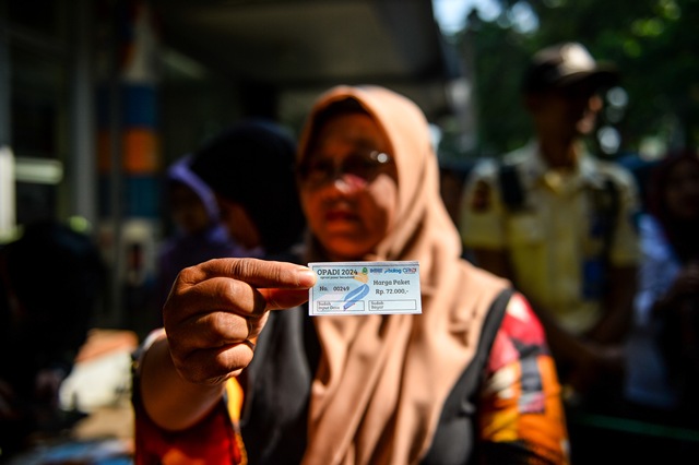 Penduduk menunjukkan kupon pada operasi pasar bersubsidi di Kantor UPTD Industri Olahan dan Kemasan, Bandung, Jawa Barat, Jumat (18/10/2024)(ANTARA FOTO/Raisan Al Farisi/rwa)
