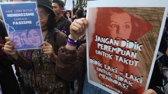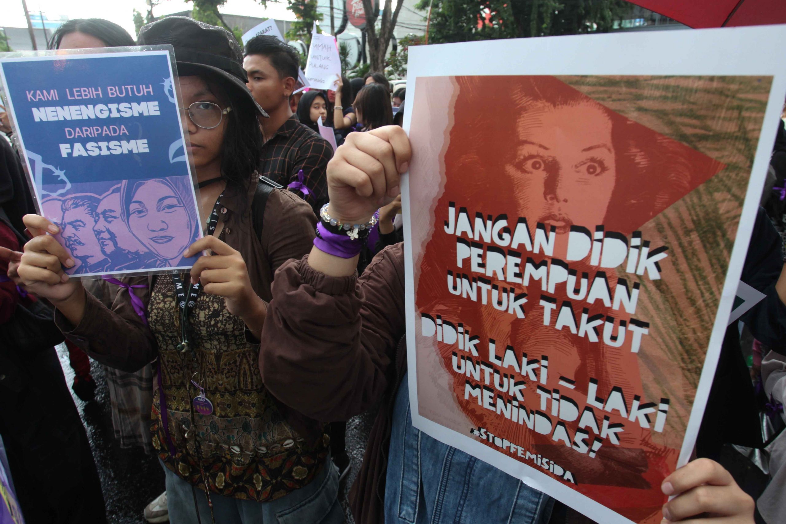Aktivis membentangkan poster Demi aksi di Surabaya, Jawa Timur, Rabu (19/3/2025). Aksi yang digelar Buat memperingati International Women’s Day (Hari Perempuan Dunia) itu mengangkat tema Arek-Arek Wani Musuh Patriarki dan Diskriminasi. ANTARA/Didik Suhartono/YU/rdi