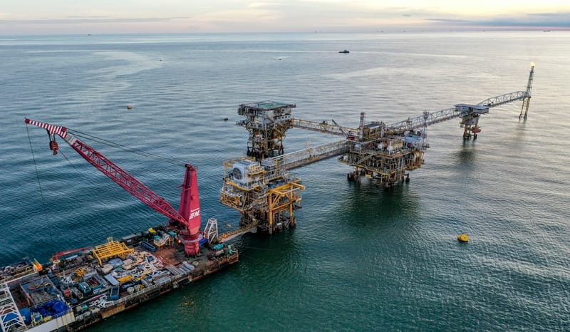 Ilustrasi–Foto udara anjungan lepas pantai lapangan Bekapai Pertamina Hulu Mahakam di Kalimantan Timur, Rabu (27/3/2024).(ANTARA/Hafidz Mubarak A)
