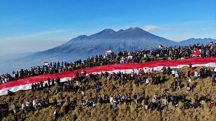 Sejumlah pendaki mengikuti upacara bendera di kawasan Puncak Pawitra Gunung Penanggungan, Kabupaten Mojokerto, Jawa Timur, Minggu (17/8/2025). Sekeliling lima ribu pendaki dari berbagai daerah melakukan pendakian dan mengikuti upacara memperingati HUT ke-80 RI di gunung tersebut dengan membentangkan bendera Merah Putih sepanjang seribu meter. ANTARA/Muhammad Mada/gus
