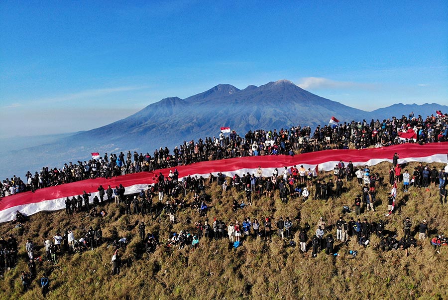 Sejumlah pendaki mengikuti upacara bendera di kawasan Puncak Pawitra Gunung Penanggungan, Kabupaten Mojokerto, Jawa Timur, Minggu (17/8/2025). Sekeliling lima ribu pendaki dari berbagai daerah melakukan pendakian dan mengikuti upacara memperingati HUT ke-80 RI di gunung tersebut dengan membentangkan bendera Merah Putih sepanjang seribu meter. ANTARA/Muhammad Mada/gus