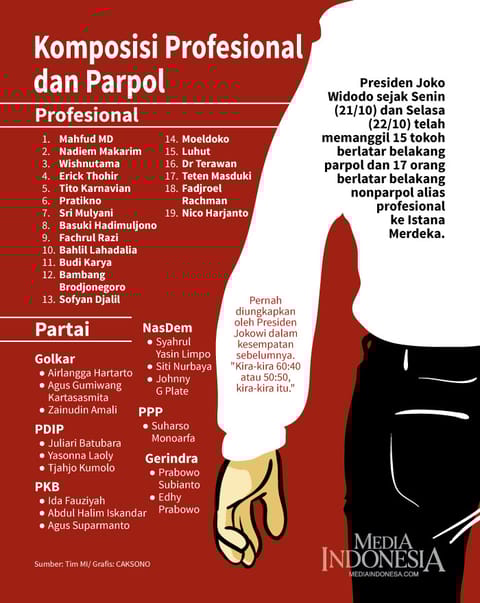 PRESIDEN Joko Widodo sejak Senin (21/10) dan Selasa (22/10) telah memanggil 15 tokoh berlatar belakang parpol dan 17 orang berlatar belakang nonparpol alias profesional ke Istana Merdeka. Dalam pertemuan, Presiden mengungkapkan sejumlah Asa terhadap para tokoh tersebut Kepada memimpin gerak kementerian selaku pembantu presiden.