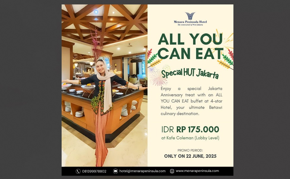 DALAM rangka memperingati Hari Ulang Tahun ke-498 Kota Jakarta, Menara Peninsula Hotel menghadirkan pengalaman Masakan istimewa bertema Jakarta Buffet. Diadaakan Akurat pada hari lahir Kota Jakarta Adalah 22 Juni, para tamu dapat menikmati hidangan buffet spesial dengan aneka menu autentik khas Betawi yang jarang ditemukan di tempat lain.