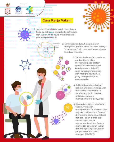 Setelah disuntikkan, vaksin membawa kode genetik protein spike ke sel tubuh dan tubuh Anda mulai memproduksi protein spike sendiri. Sel kekebalan tubuh dalam darah mengenali protein spike tersebut sebagai ‘si penyusup’, lalu memulai reaksi sistem kekebalan tubuh