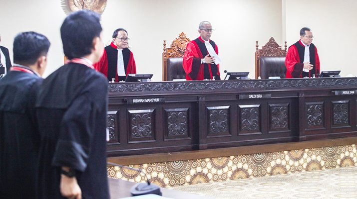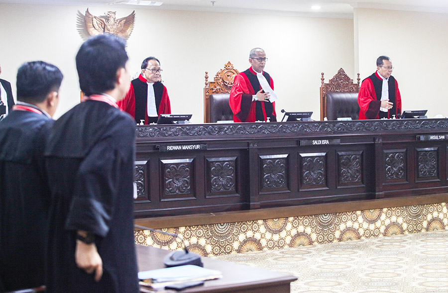 Ketua Hakim Panel III, Saldi Isra (tengah) didampingi Hakim Konstitusi Arsul Sani (kanan) dan Hakim Konstitusi Ridwan Mansyur memimpin sidang gugatan sengketa Pemilihan Bunyi Ulang (PSU) Pilkada Kabupatan Pesawaran, Kota Palopo dan Kabupaten Mahakam Ulu di Mahkamah Konstitusi, Jakarta, Selasa (17/6/2025). Sidang sengketa PSU Pilkada 2024 tersebut mengagendakan pembacaan dalil pemohon dan pengesahan alat bukti. MI/Usman Iskandar/gus