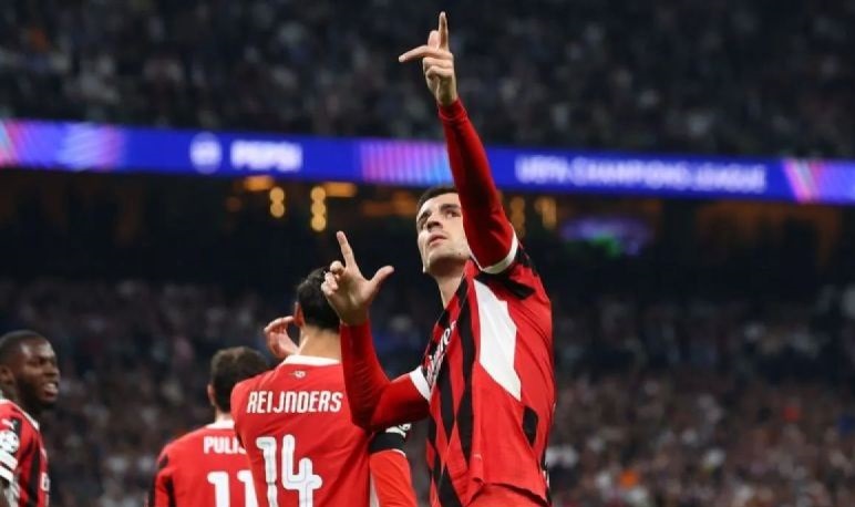 Selebrasi Alvaro Morata setelah mencetak gol Demi AC Milan dalam pertandingan Aliansi Champions 2024/25 Rival Real Madrid di Santiago Bernabeu pada Rabu (6/11/2024). ANTARA/ACMilan