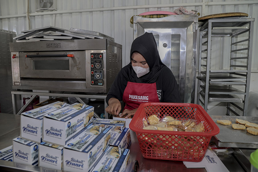 Seorang pekerja kue kenari produk UMKM di rumah produksi Pakaesang, Ternate, Maluku Utara, Sabtu (6/9/2025). Komisi VII DPR RI menyetujui penambahan anggaran Kementerian Usaha Mikro Kecil dan Menengah (UMKM) pada 2026 yang awalnya sebesar Rp296,59 miliar, naik menjadi Rp722,1 miliar, sebagai upaya pengentasan kemiskinan dan menciptakan lapangan kerja melalui kewirausahaan dan UMKM. ANTARA/Andri Saputra/gus