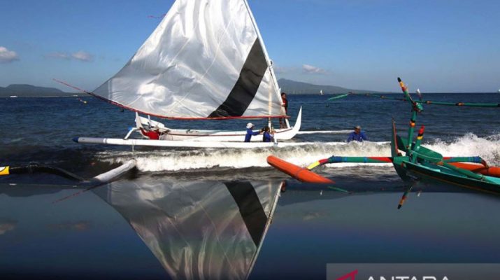 Nelayan menyiapkan perahunya dalam tradisi balap Bahtera layar di Ketapang Banyuwangi, Jawa Timur, Minggu (14/5/2023). Balap Bahtera layar tersebut merupakan tradisi nelayan di pesisir Selat Bali yang rutin digelar sebagai sarana silaturahim dan juga upaya menarik kunjungan wisatawan. ANTARA FOTO/Budi Candra Setya/nym.