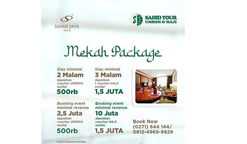 Public Relations Manager Hotel Absahid Jaya Solo, Septiarona S, mengatakan Hotel Absahid Jaya Solo kali ini berkolaborasi dengan salah satu unit group yaitu Absahid Tour Umrah dan Haji dengan meluncurkan paket promo “MEKAH PACKAGE”. Di mana paket ini mulai periode bulan Agustus sampai dengan September, dengan minimal stay 2 malam, tamu akan mendapatkan voucher Umroh senilai Rp500.000 dan selama stay minimal 3 malam, tamu akan mendapatkan voucher Haji senilai Rp1.500.000.