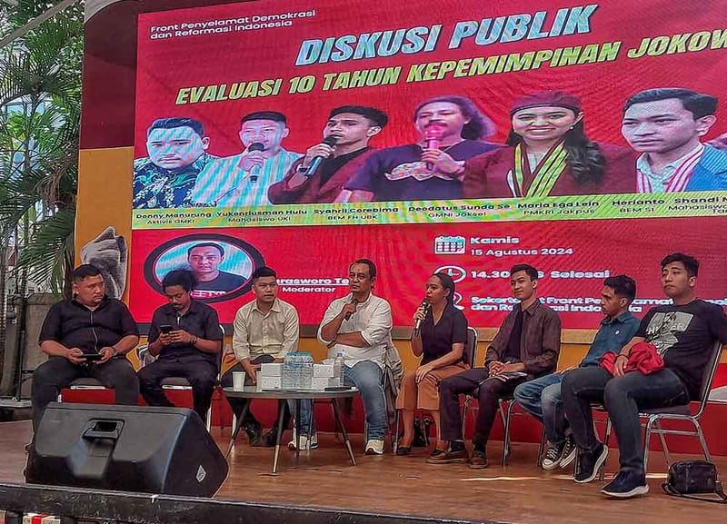 Para aktivis mahasiswa (dari kiri); Donny Manurung (aktivis GMKI), Deodatus Sunda Se (GMNI Jaksel), Yukenriusman Hulu (mahasiswa UKI), Rarasworo Tejo (moderator), Maria Ega Lein (PKRI Jakpus), Herianto (BEM SI), Syahril Corebima (BEM FH UBK), Shandi Marthapradja (Mahasiswa Muhamadiyah Tangerang) memberikan menjadi naras umber dalam Obrolan Publik bertajuk “Penilaian 10 Mengertin Kepemimpinan Jokowi” di sekretariat Front Penyelamat Reformasi Indonesia, Menteng, Jakarta, Kamis (15/8/2024). Dalam diskusi tersebut para perwakilan elemen gerakan mahasiswa sepakat untuk terus mengawal dan mengkritisi kebijakan pemerintah yang dianggap gagal dalam mengelola negara selama 10 tahun. MI/Usman Iskandar